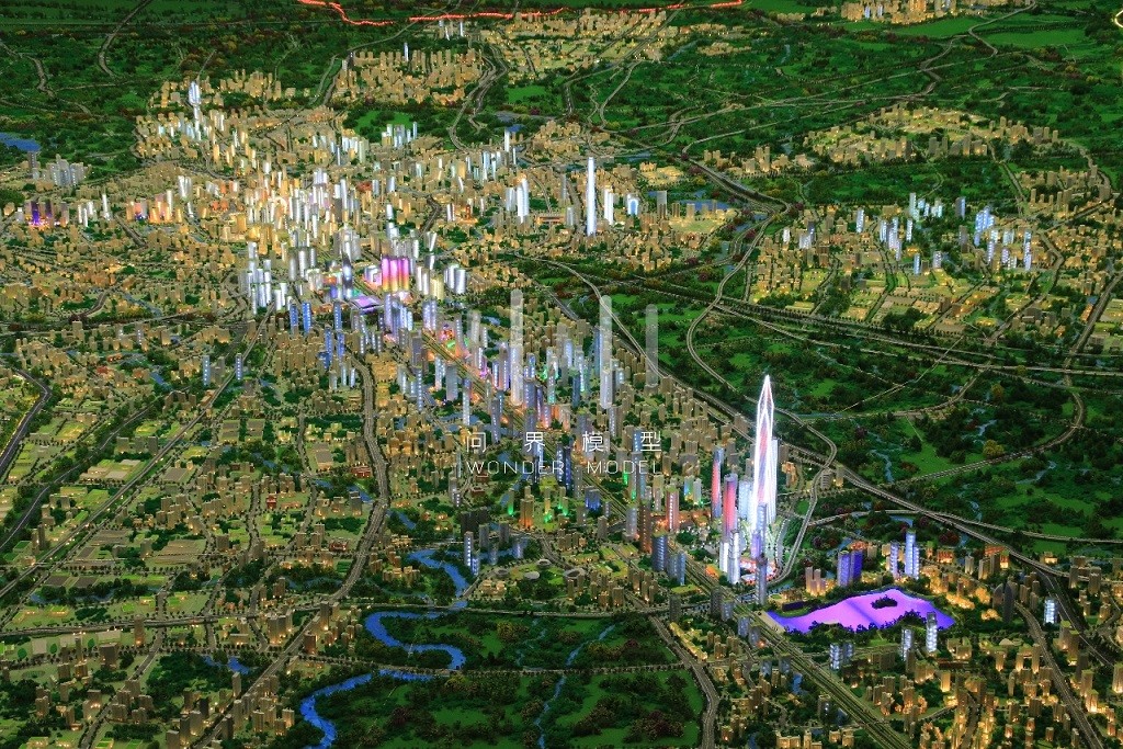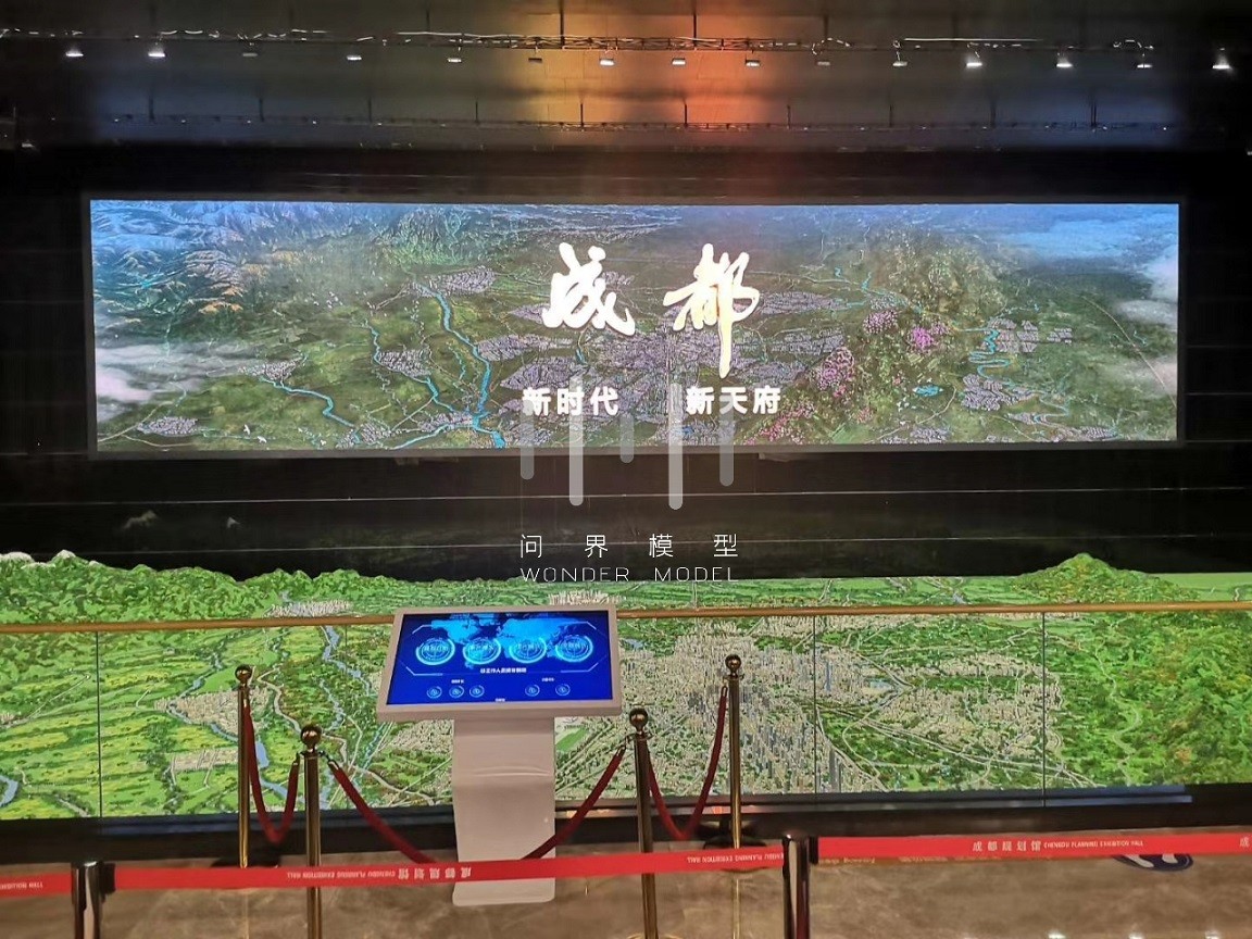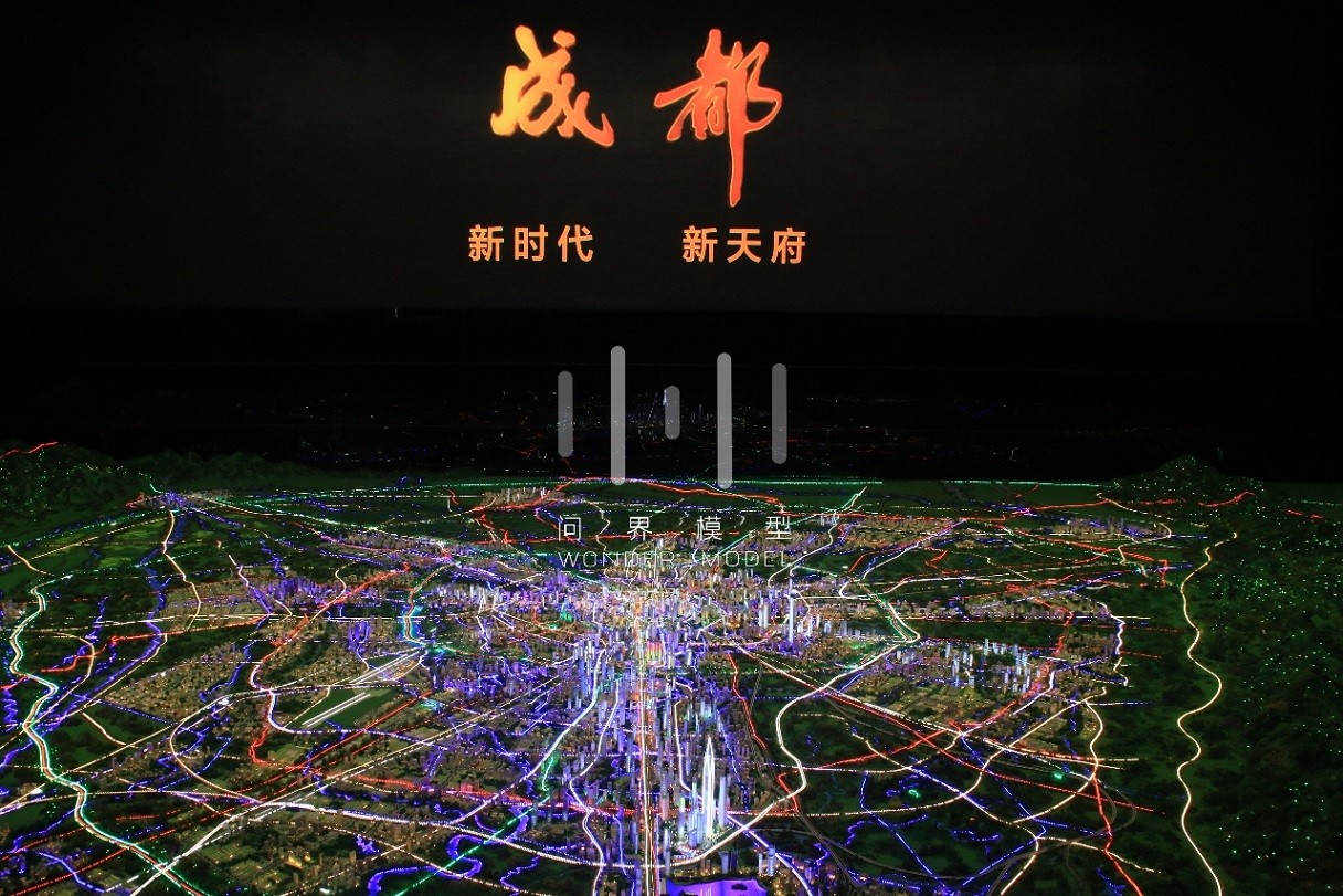 项目展示了成都市域总面积14335平方千米,模型平面比例1:3500,建筑比例:1:1200——1:1800,根据参观者的视觉效果,采用近小远大及凸显标志性建筑、重点项目、景观生态的展示特征,对整体模型做了艺术表现处理。