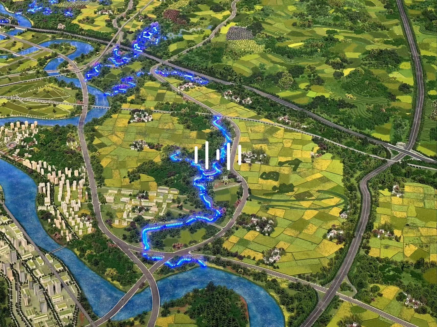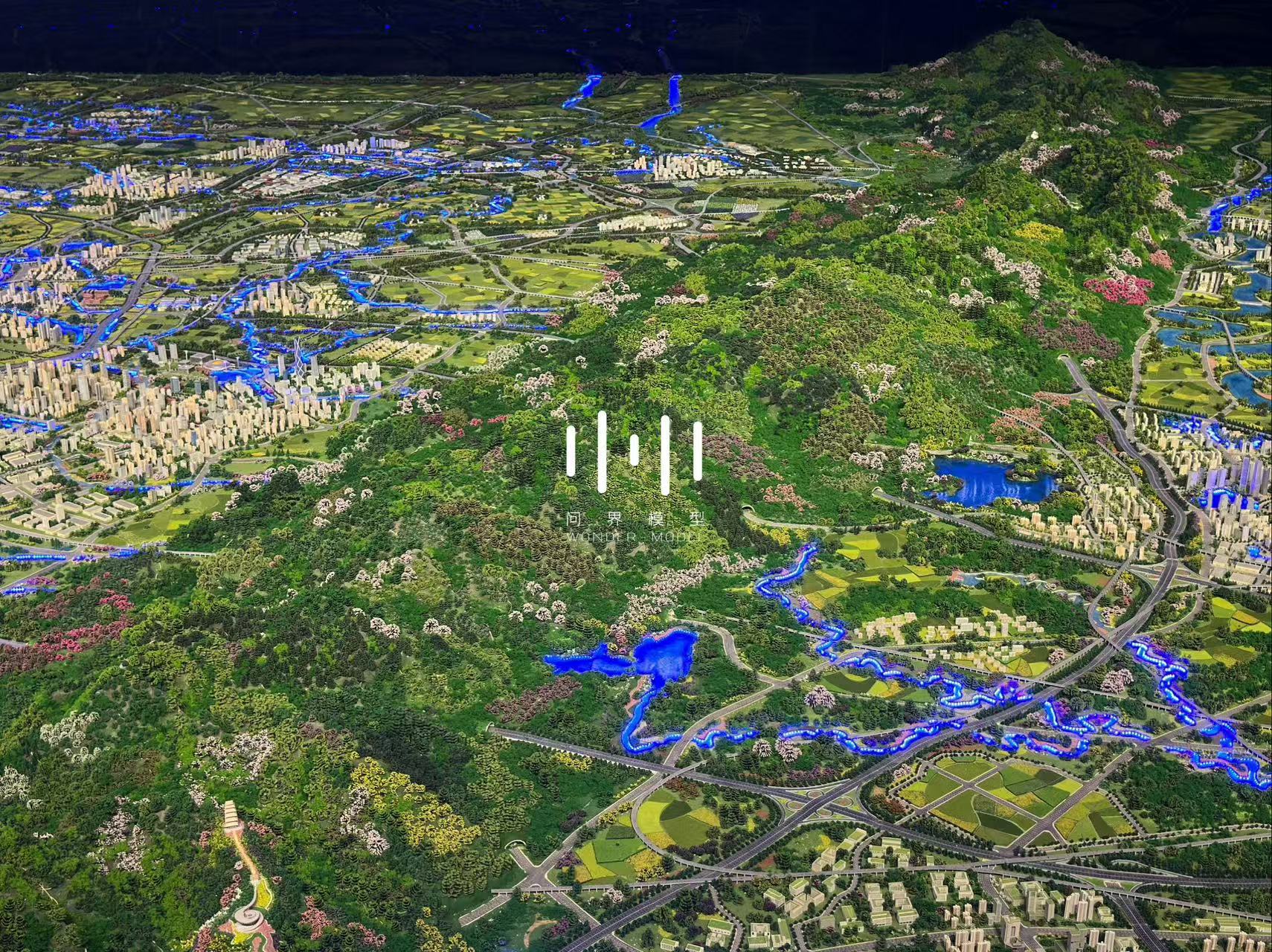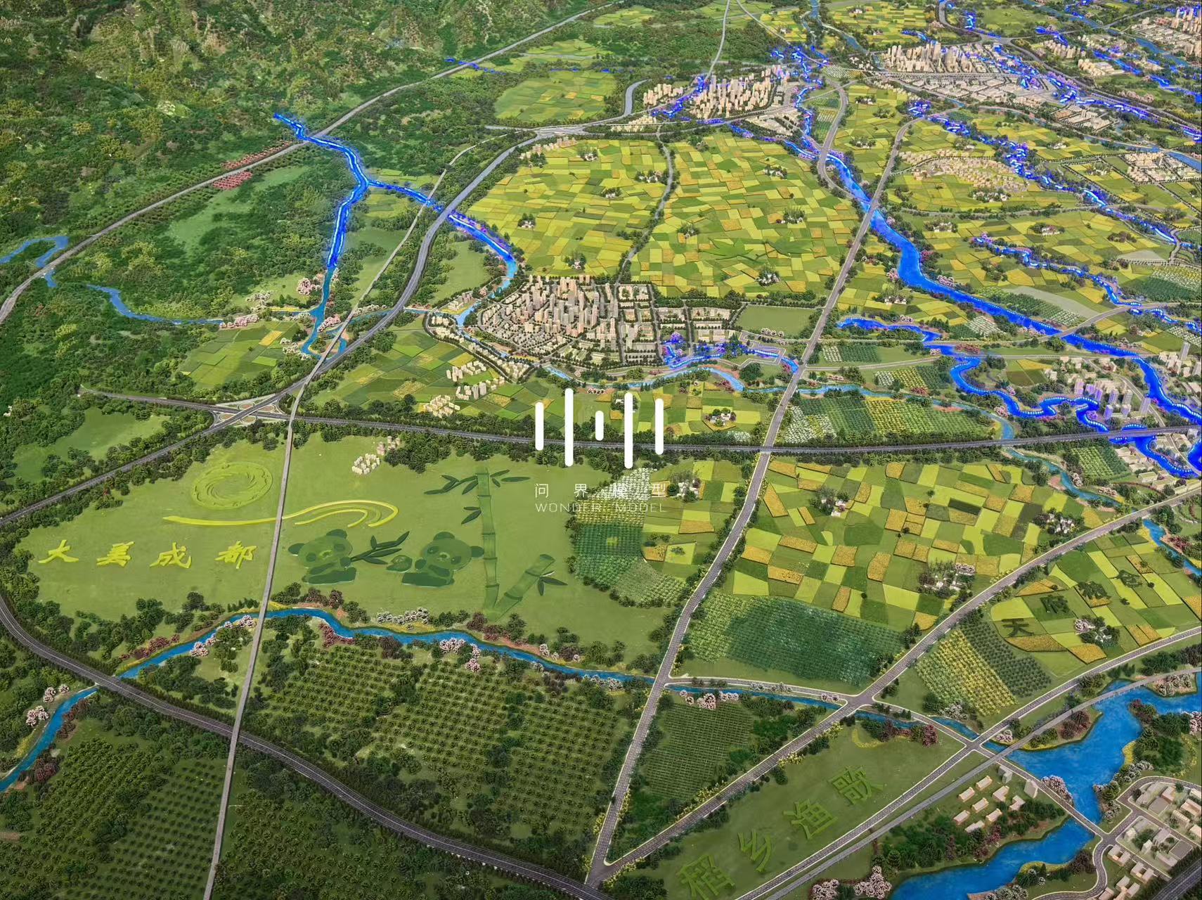 契合成都市域国土空间空间规划理念,表现了成都是雪山下的公园城市,总体体现“壮美山峰—绵延丘陵—千里沃野—现代城镇”的公园城市自然地理特征,整体呈现“两山相望、两水相依、两林相映、两田相异”的自然地理格局,凸显了“三区三线”城市空间结构。模型从山、水、林、路网、轨道、铁路、建筑、农田八大要素着手,通过适当艺术夸张的创新表现手法, 体现人与自然和谐共生,突出了公园城市的高质量发展,展示了成都的建设现状及未来规划风貌。
