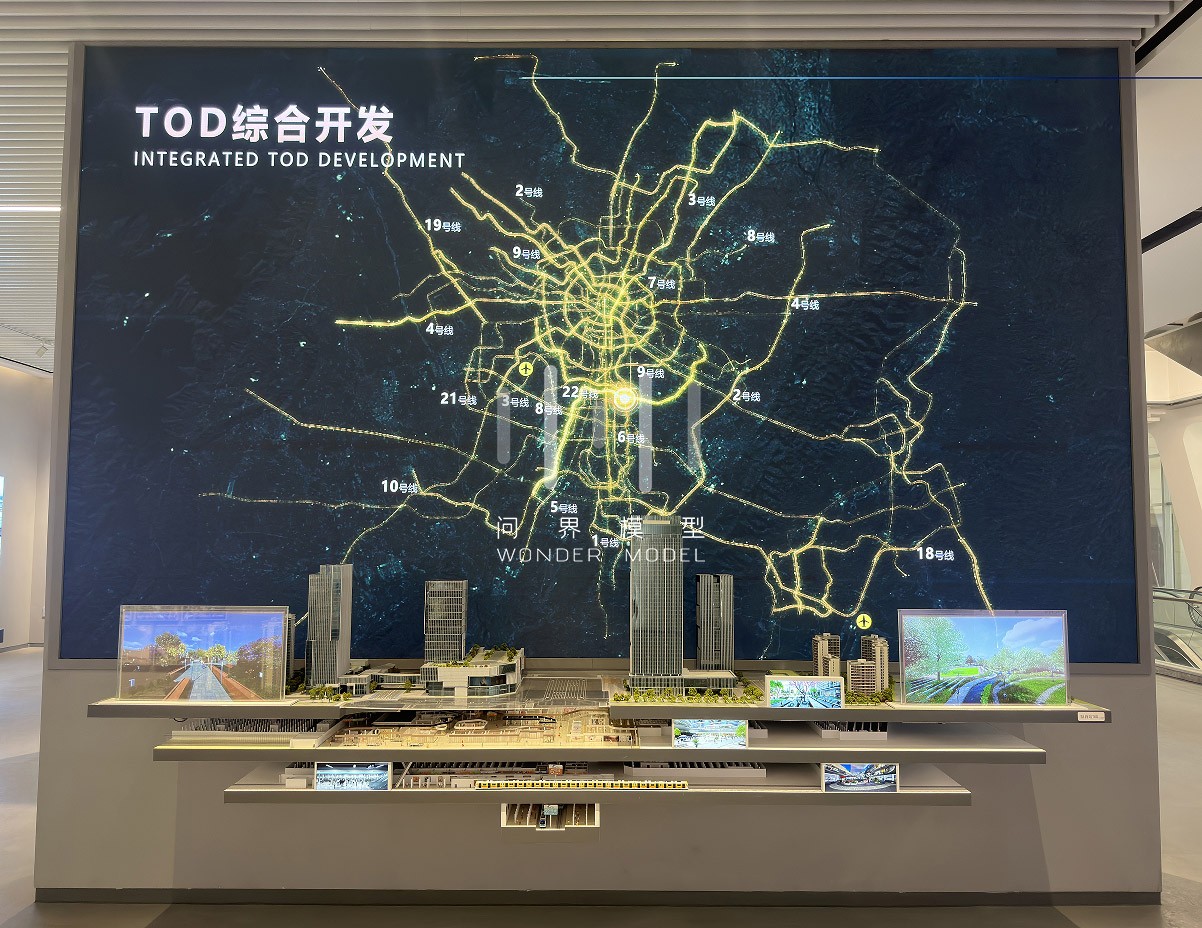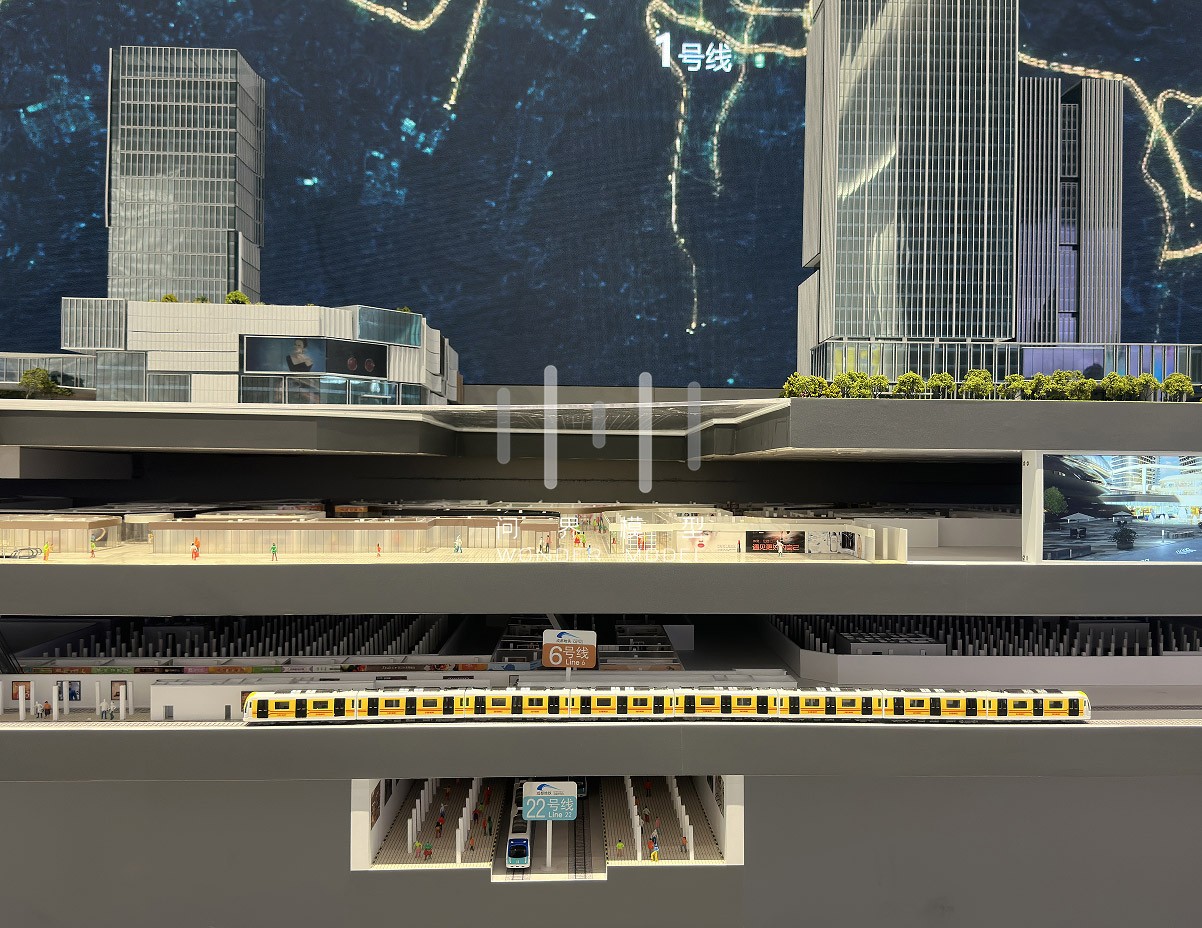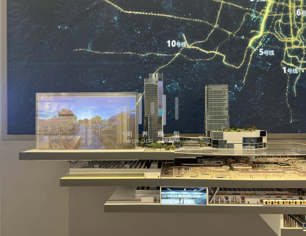 项目以陆肖站建设现状及未来设计规划为背景,模型结合平、立剖展示形式,纵向夸张立面空间,展示了地下商业、交通换乘等设施。项目结合数字视频表现,围绕以陆肖站为核心的15分钟生活圈,展示了居住、商业、办公、文化、休闲、景观的生活场景;体现了了以公共交通为导向的未来生活方式,通过一体化的城市功能布局,和城市空间格局的巧妙设计,为人们展现了一副全然不同的城市生产生活画卷,描摹出了了未来TOD城市全新生活方式的理想示范。
