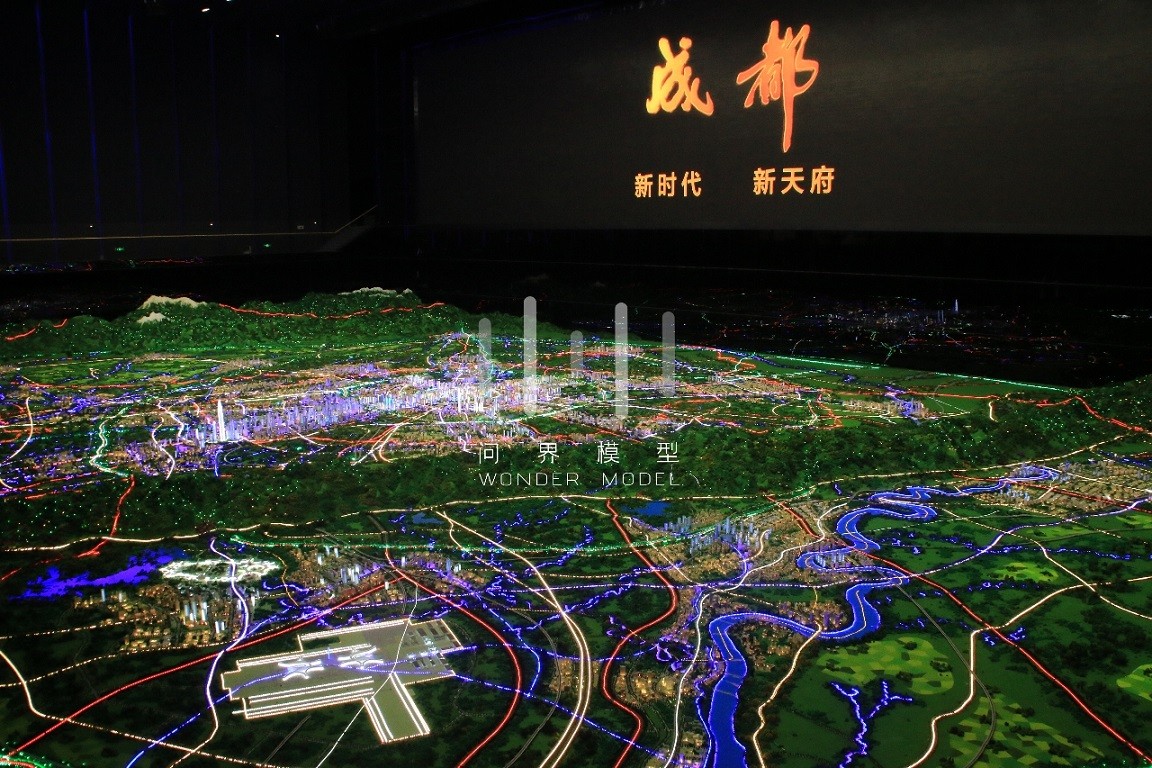 项目展示了成都市域总面积14335平方千米,模型平面比例1:3500,建筑比例:1:1200——1:1800,根据参观者的视觉效果,采用近小远大及凸显标志性建筑、重点项目、景观生态的展示特征,对整体模型做了艺术表现处理。